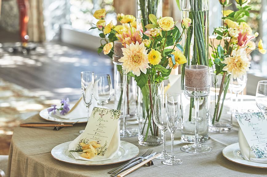 柔らかな光が差し込む空間は、どんな装花・装飾とも調和し、おふたりの世界観を自由に表現できます。一皿ごとに感動を届けるフルコースと、心地よい距離感で楽しめる上質な空間で、ゲストの記憶に残るひとときを演出します。