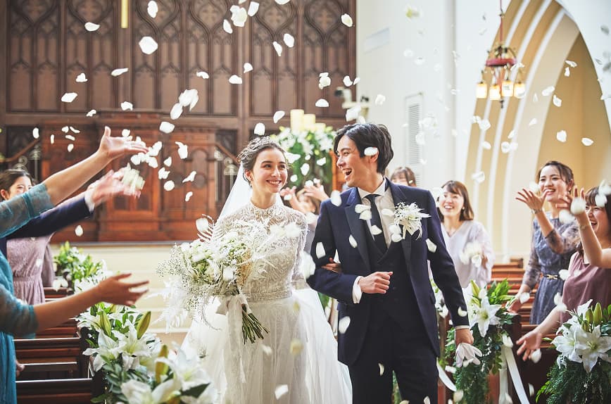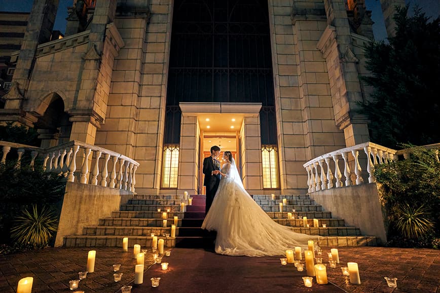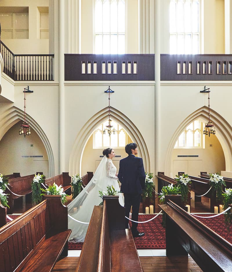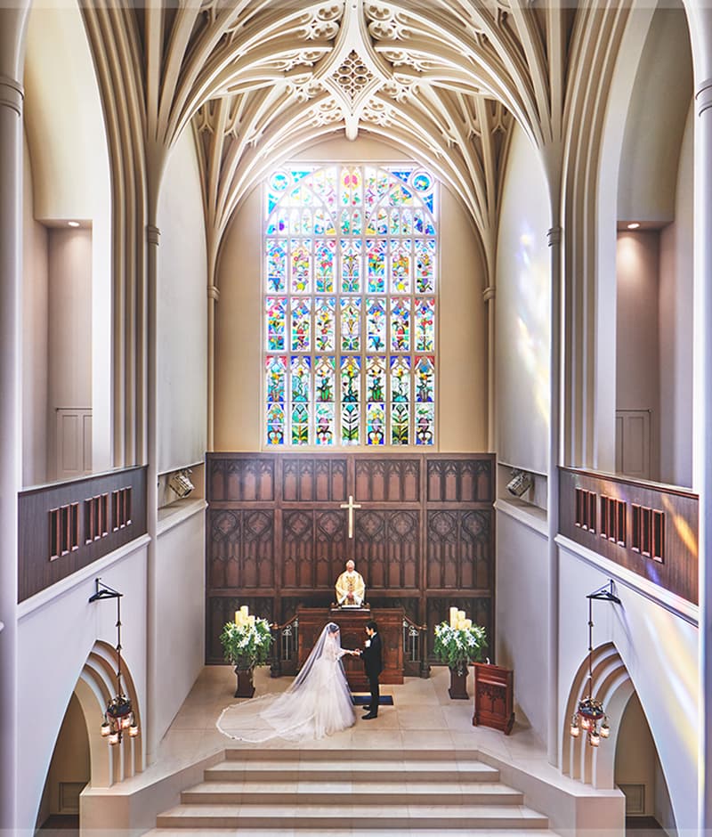 英国のアビーチャーチを継承する本格的なゴシック建築。高さ15mの天井、荘厳なアーチ構造、時間とともに表情を変えるステンドグラスが、ドラマチックな挙式空間をつくりあげます。
